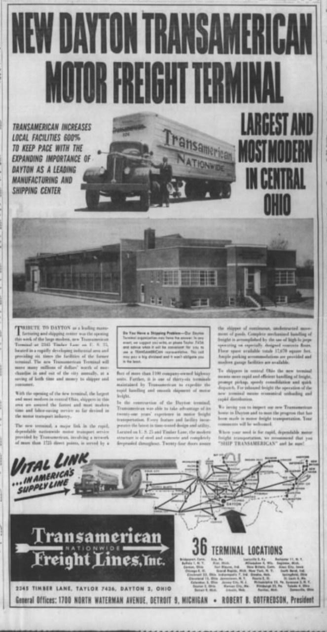 Nice newspaper advertising for new Dayton, Ohio terminal opening, with photo of Truck, terminal, route map and listing of terminals.