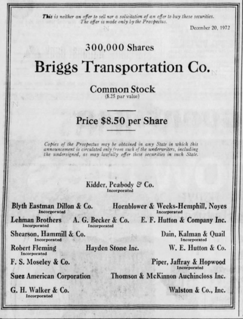 Times were good for Briggs Transportation during the 1970″s with more acquisitions, additional territory to serve, more equipment purchases and one important financial milestone. The company went public and offered shares of common stock!