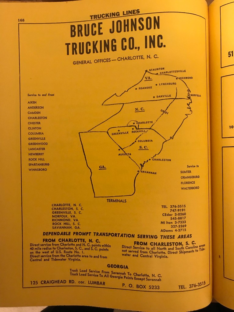 As readers of this website know a lot of my research comes from old city directories from the metropolitan cities that had a concentration of trucking operations. This advertisement appeared in a 1962 Charlotte, North Carolina directory. Charlotte, for those who might not know, was the home base for many large and small trucking companies. Names of the well known carriers that immediately come to mind are Akers Motor Lines, Central Motor Lines, Johnson Motor Lines, Thurston Motor Lines and Bruce Johnson Trucking Company.