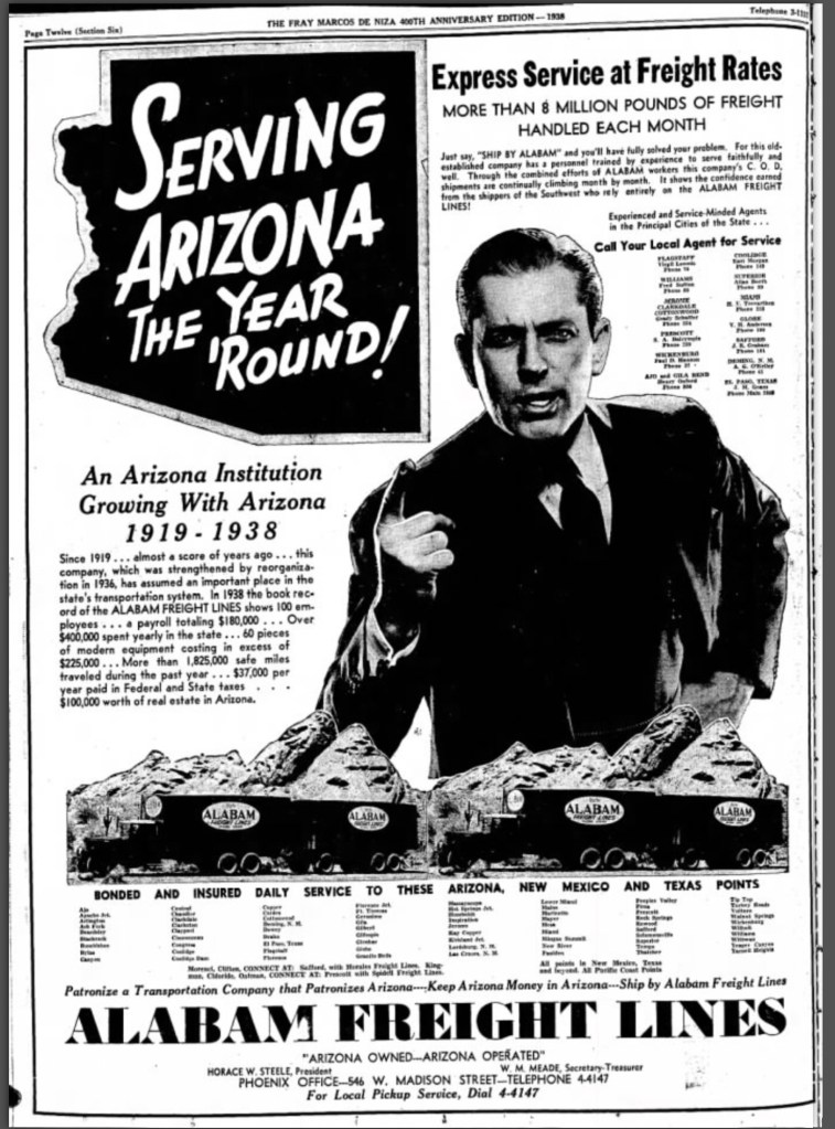 From the November 20, 1938 edition of the Arizona Republic newspaper in Phoenix I found this full page advertisement for Alabam’s Fright Line which was one of the largest carriers in the southwest at the time. nine years earlier, in October 1929, the company offered to the public $50,000 of 8% preferred stock.